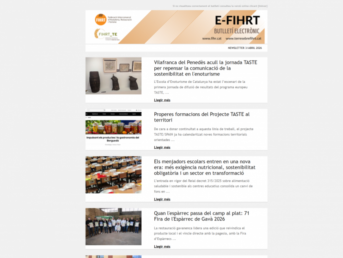 L' E-FIHRT/3 ABRIL 2026 ofereix una panoràmica clara d’un sector —el de l’hostaleria, el turisme i l’agroalimentació— immers en un procés de transformació profunda, on la sostenibilitat, la innovació i els canvis normatius esdevenen eixos centrals.