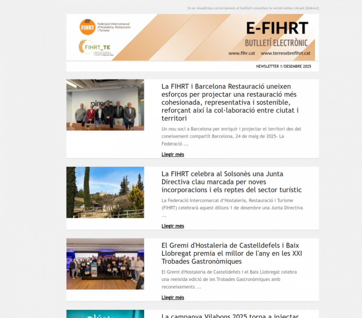 La Federació Intercomarcal d’Hostaleria, Restauració i Turisme (FIHRT) ha publicat l’edició del seu newsletter E-FIHRT corresponent a l’1 de desembre de 2025, un butlletí especialment ric en continguts que reflecteixen la vitalitat del sector i la importància creixent de la cooperació territorial.