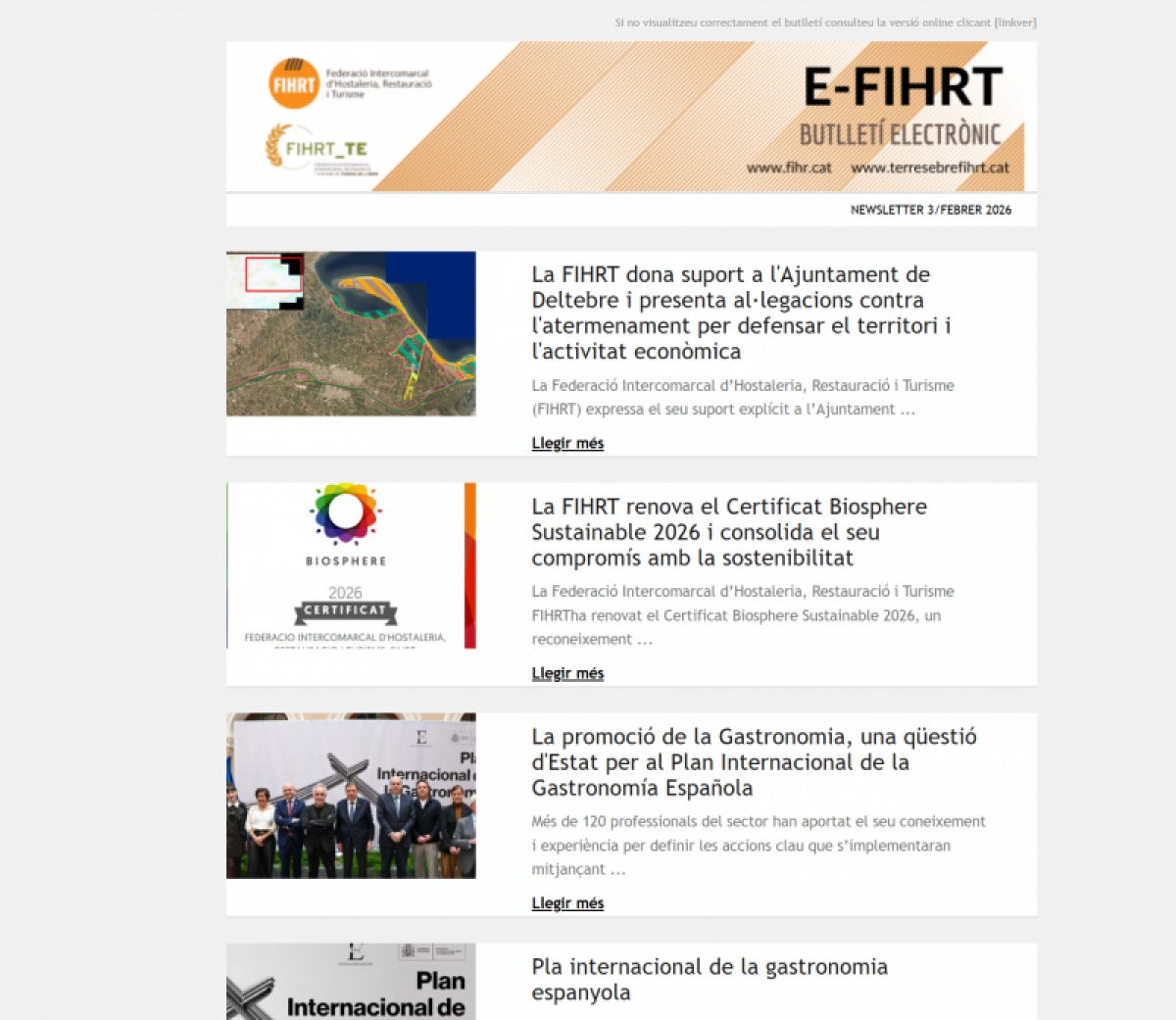 La Federació Intercomarcal d’Hostaleria, Restauració i Turisme (FIHRT) ha situat la defensa del territori i l’activitat econòmica com a eix central del seu darrer butlletí electrònic, corresponent al 3 de febrer de 2026