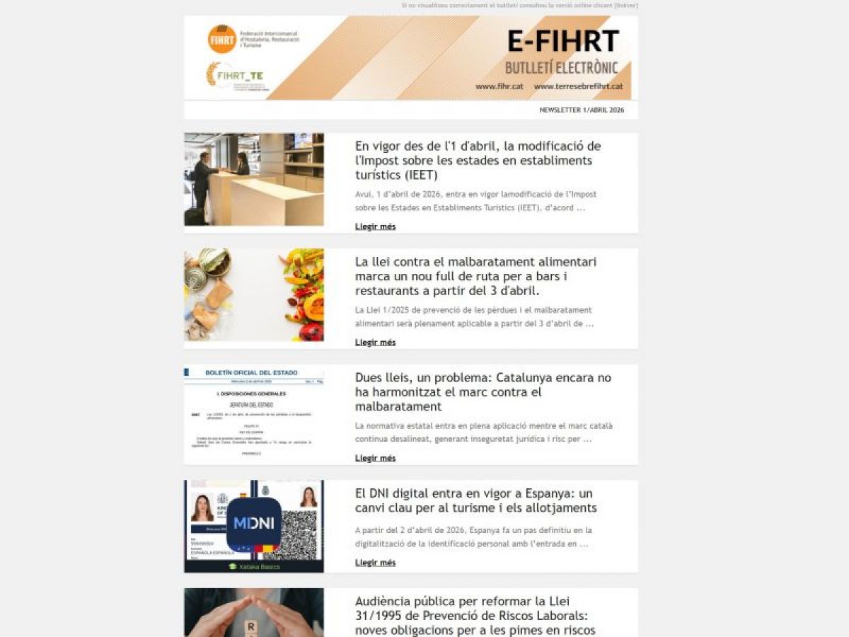 L’actualitat ve encapçalada per l’entrada en vigor de mesures amb impacte directe i immediat. D’una banda, la modificació de l’Impost sobre les Estades en Establiments Turístics (IEET), vigent des de l’1 d’abril, que incrementa la càrrega fiscal sobre l’activitat turística. De l’altra, l’aplicació plena de la Llei contra el malbaratament alimentari a partir del 3 d’abril, que redefineix processos interns de bars i restaurants i introdueix noves exigències operatives i administratives. A aquest context s’hi suma la manca d’harmonització normativa entre l’àmbit estatal i català, que genera inseguretat jurídica i complica la gestió empresarial.