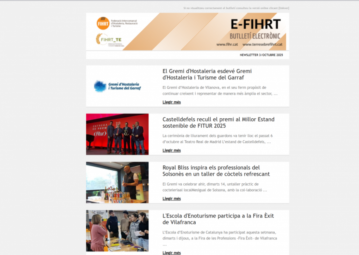 L’edició del tercer número d'octubre d’E-FIHRT recull una àmplia activitat gremial i institucional arreu del territori. Entre les principals novetats destaca la transformació del Gremi d’Hostaleria de Vilanova en el Gremi d’Hostaleria i Turisme del Garraf, reafirmant el seu compromís amb la representació global del sector. També es fa ressò del premi al Millor Estand sostenible de FITUR 2025, atorgat a Castelldefels, i de diverses iniciatives gastronòmiques com el Volta i Tapa’t de Deltebre, la nova Ruta Gastronòmica del Gremi de Viladecans, o el Concurs Nacional d’Arròs DOP Delta de l’Ebre celebrat a Camarles.