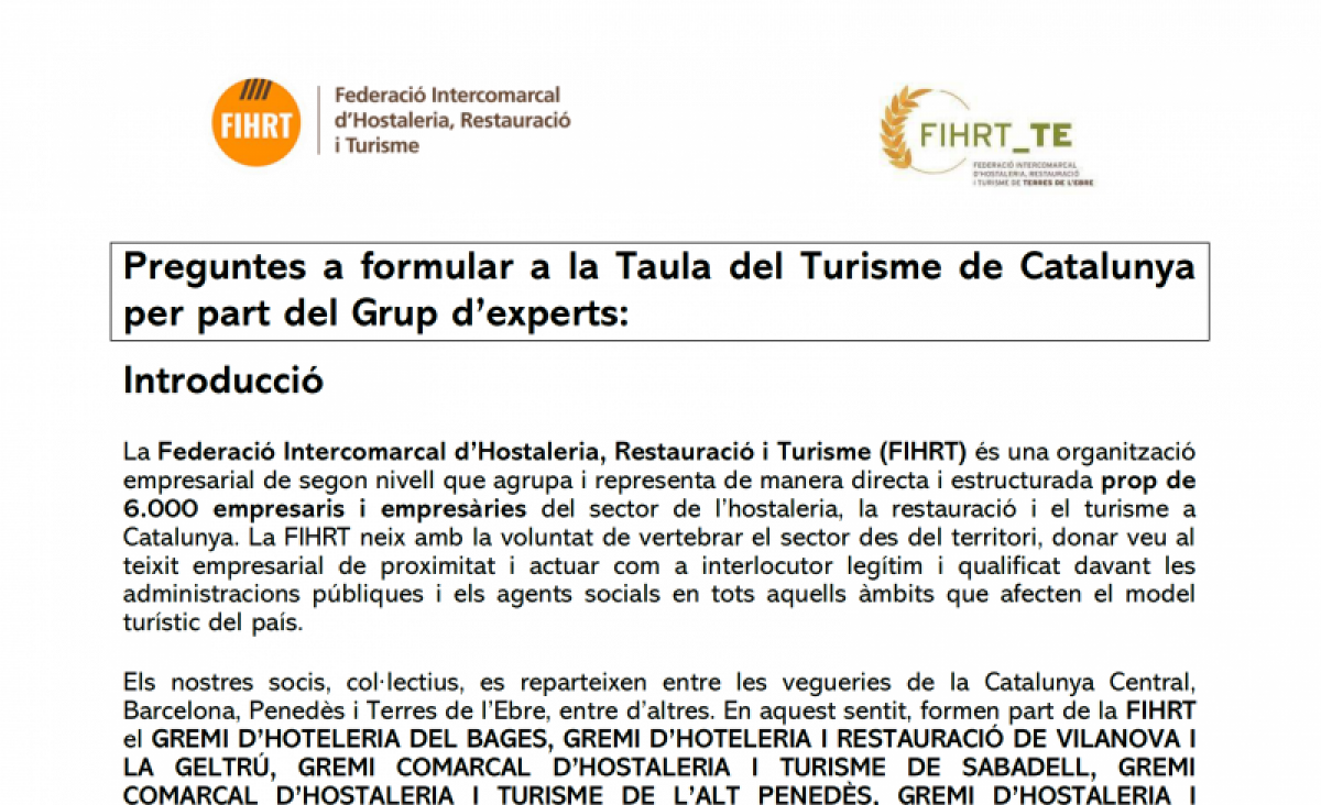 La Federació Intercomarcal d’Hostaleria, Restauració i Turisme (FIHRT) ha presentat les seves aportacions al conjunt de respostes formulades pel Grup d’Experts en turisme en el marc del procés d’elaboració de la nova Llei de Turisme de Catalunya. Aquesta contribució s’ha dut a terme en qualitat de membre de la Taula del Turisme de Catalunya, òrgan de participació i assessorament del Govern en matèria de política turística.