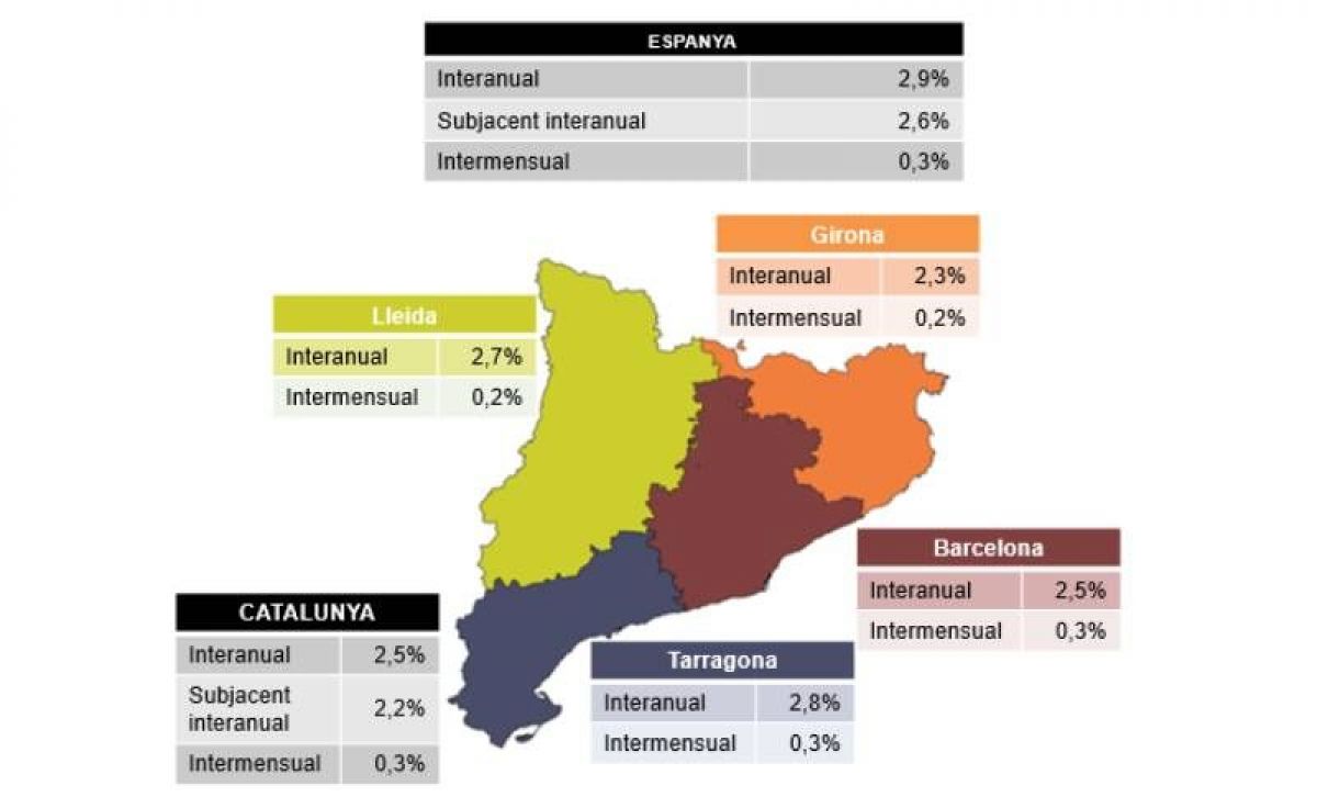 - En termes de variació interanual, l’increment a Catalunya continua per sota del d’Espanya (2,5% i 2,9%, respectivament). La inflació subjacent se situa a Catalunya quatre dècimes per sota la que registra Espanya (2,2% i 2,6%, respectivament).