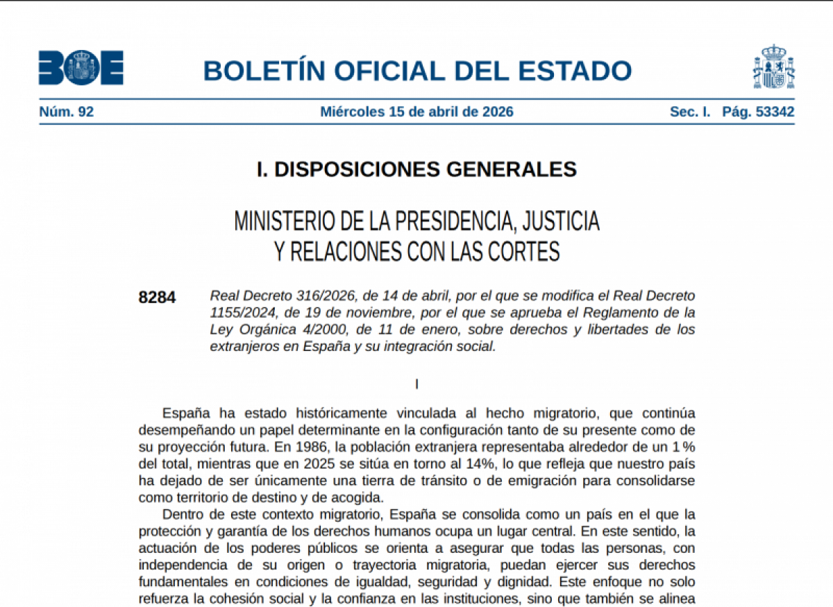S’ha publicat al Butlletí Oficial de l’Estat núm. 92, de 15 d’abril de 2026, el Reial decret 316/2026, de 14 d’abril, pel qual es modifica el Reial decret 1155/2024, de 19 de novembre, pel qual s’aprova el Reglament de la Llei Orgànica 4/2000, d’11 de gener, sobre drets i llibertats dels estrangers a Espanya i la seva integració social. La norma entra en vigor avui, 16 d’abril de 2026. El termini per sol·licitar les noves autoritzacions finalitza el 30 de juny de 2026.