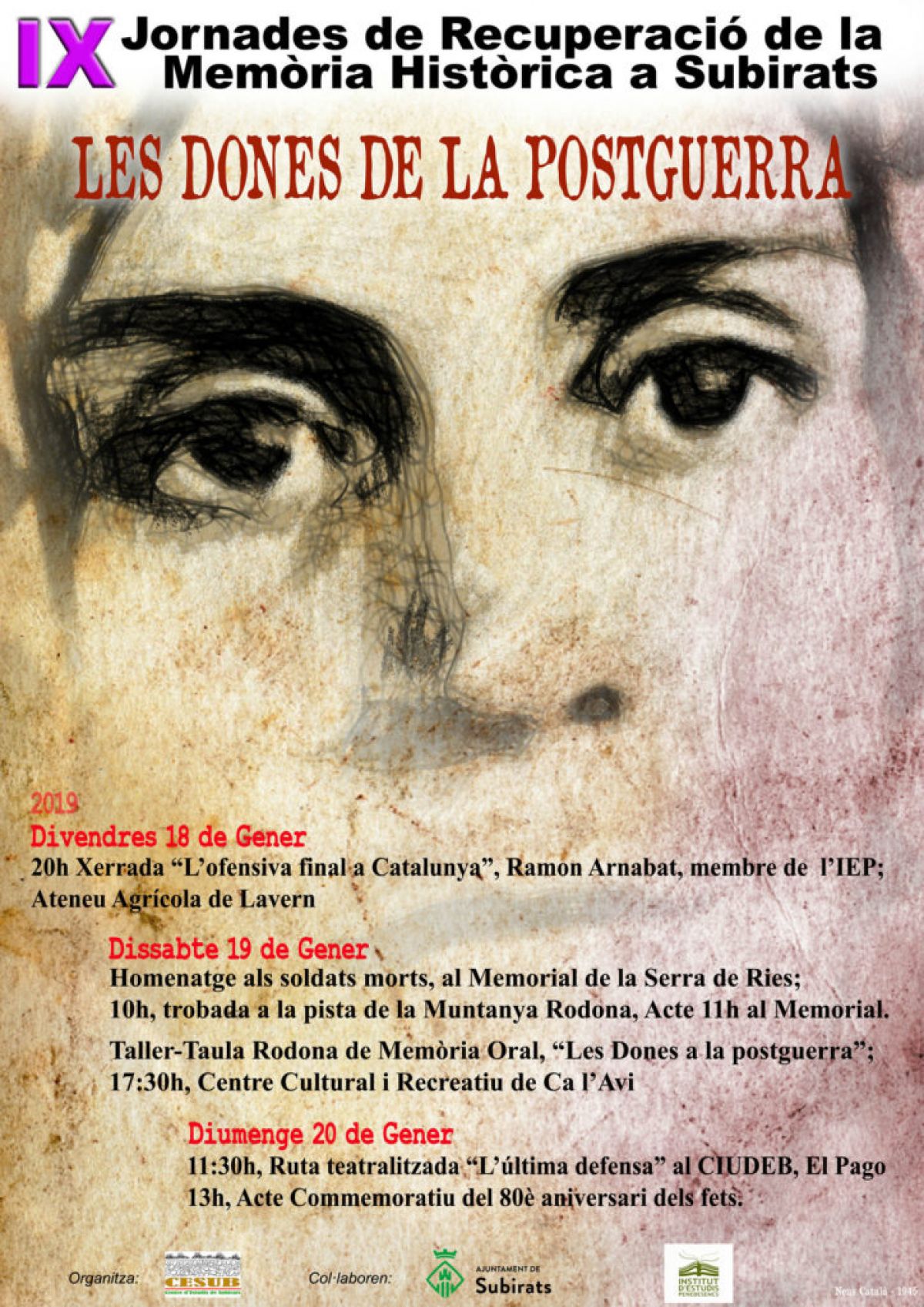 Aquest cap de setmana el Centre d’Estudis de Subirats (CESUB) organitza unes Jornades de Memòria Històrica intentant coincidir amb les dates de la batalla d’Ordal, la qual va ser l’última defensa de Barcelona entre el 22 i 23 de gener de 1939. En aquesta ocasió se celebrarà el 80è aniversari amb la col·laboració de l’Institut d’Estudis Penedesencs (IEP).