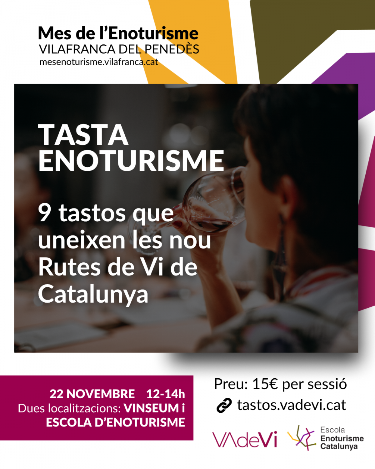 L’activitat consistirà en nou tastos, un per cada Ruta del Vi de Catalunya, que es faran simultàniament en dos espais de Vilafranca: el Vinseum i l’Escola d’Enoturisme de Catalunya.