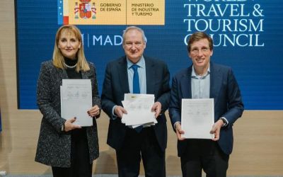 El ministre d’Indústria i Turisme, Jordi Hereu, i la presidenta del Consell Mundial de Viatges i Turisme, Gloria Guevara, juntament amb l’alcalde ...